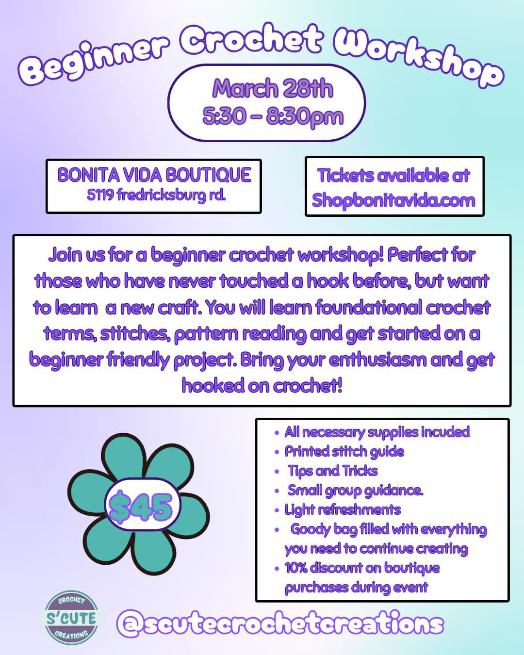 Join us for a beginner crochet workshop! Perfect for newcomers or those needing a refresher, you’ll learn foundational stitches, pattern reading, and craft a beginner friendly project!