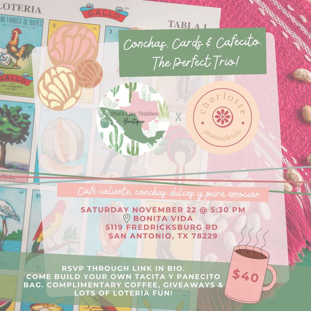 Join us for an evening filled with delicious concha’s from Charlotte Panadería, hot Cafecito as you build your own mug and pan dulce bag & also enjoy playing a game of Lotería to win some prizes!