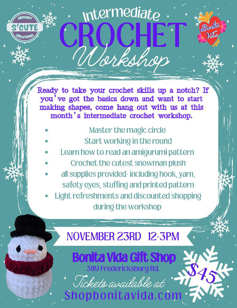 Join us for an Intermediate crochet workshop! Perfect for those who have the basics down and want to start making shapes, come hang out with us and learn!