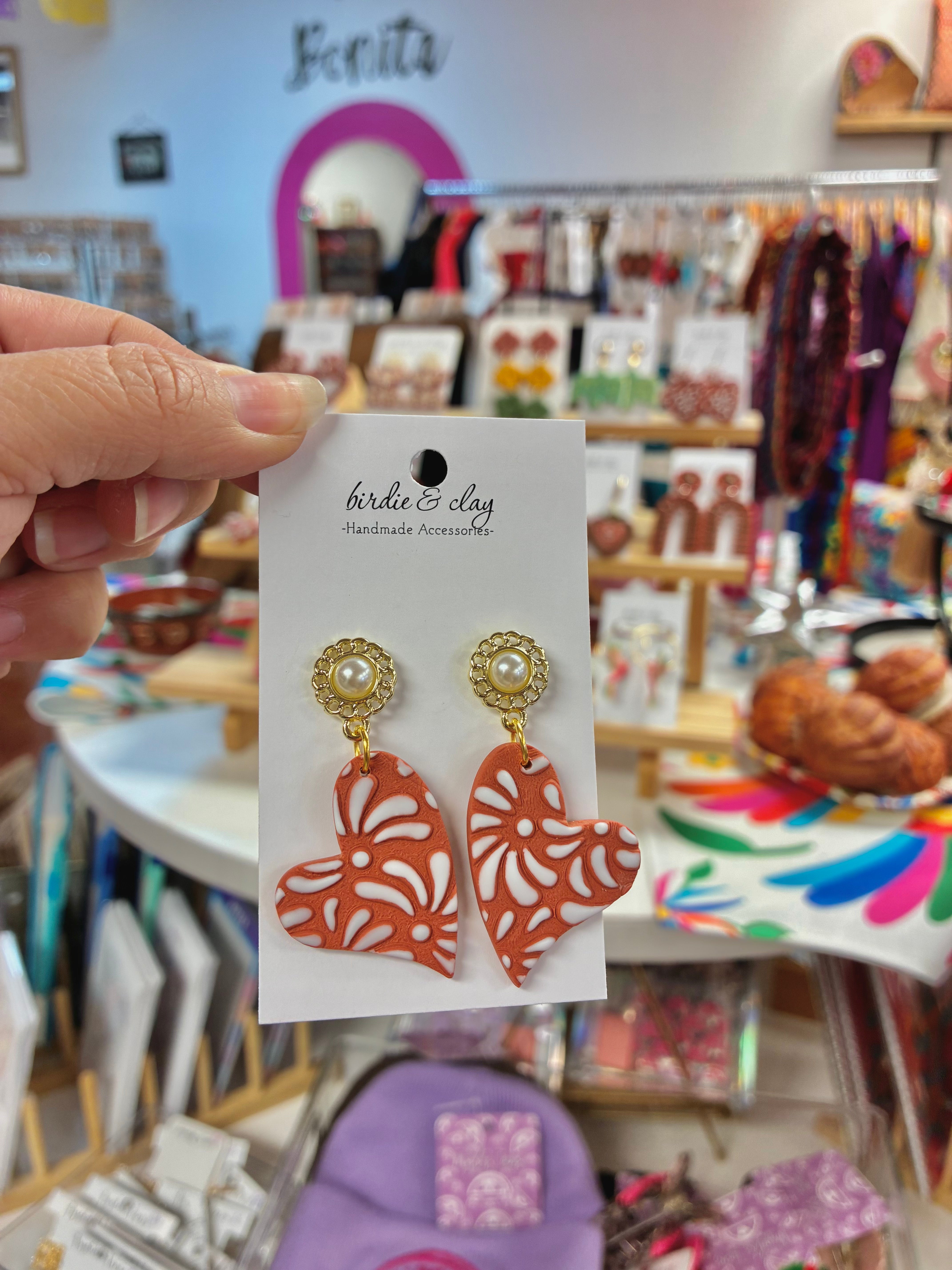 Birdie & Clay- Terracotta Talavera heart earrings is backordered and will ship as soon as it is back in stock.