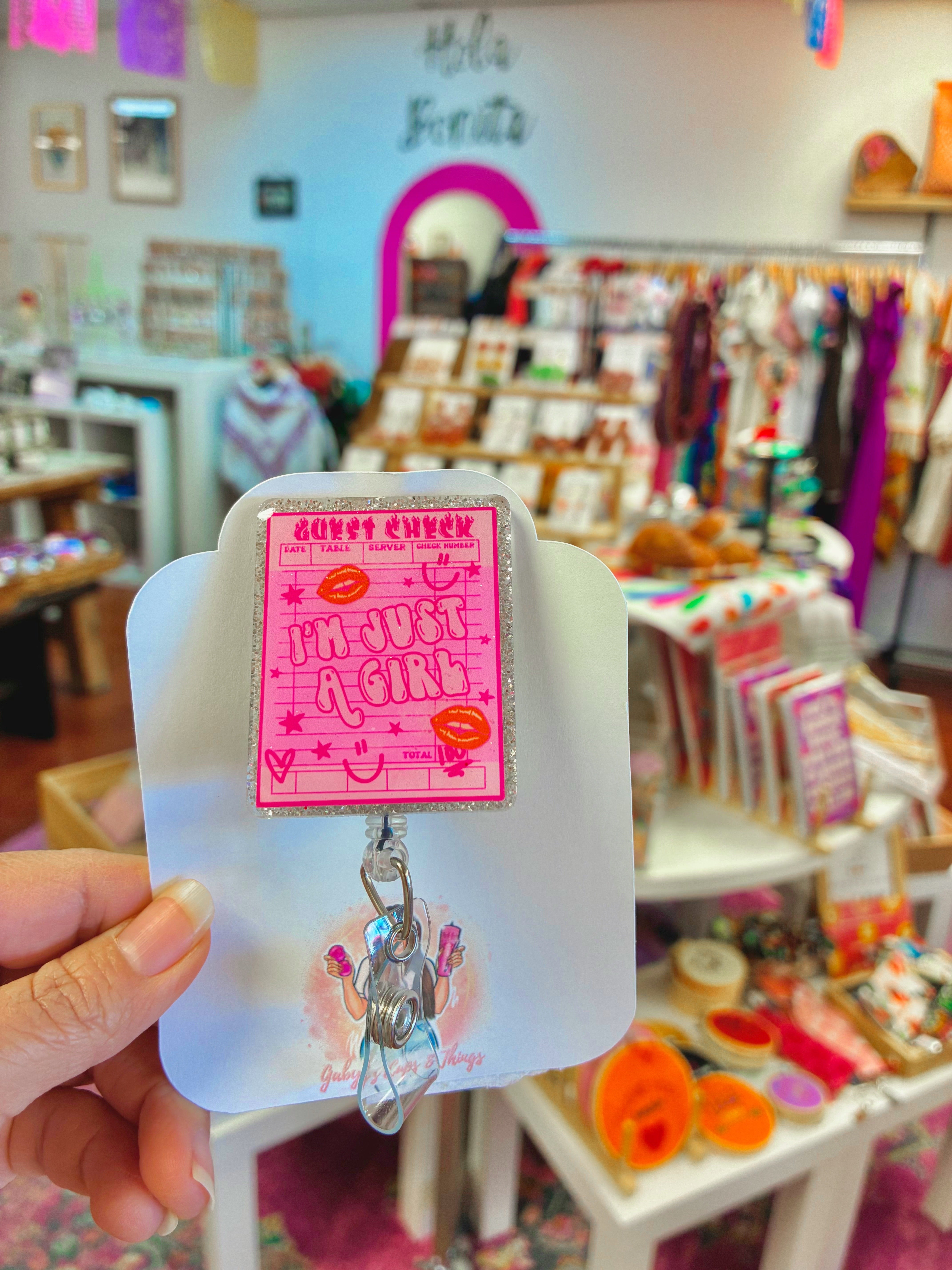 Gaby’s- I’m just a girl receipt Badge Reel is backordered and will ship as soon as it is back in stock.