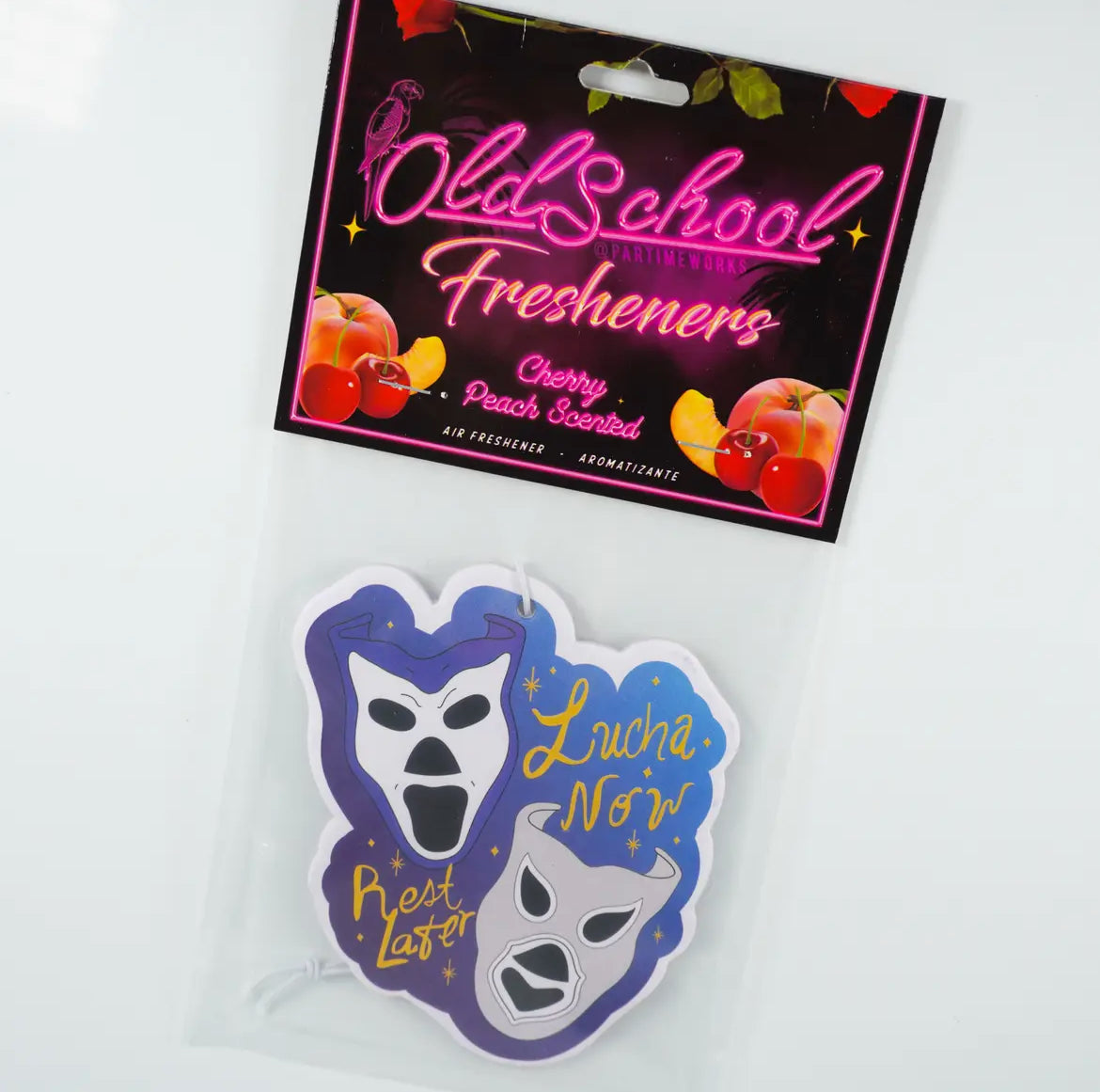 Partimeworks- Lucha Now Rest Later Air Freshener (Cherry Peach Scented) is backordered and will ship as soon as it is back in stock.