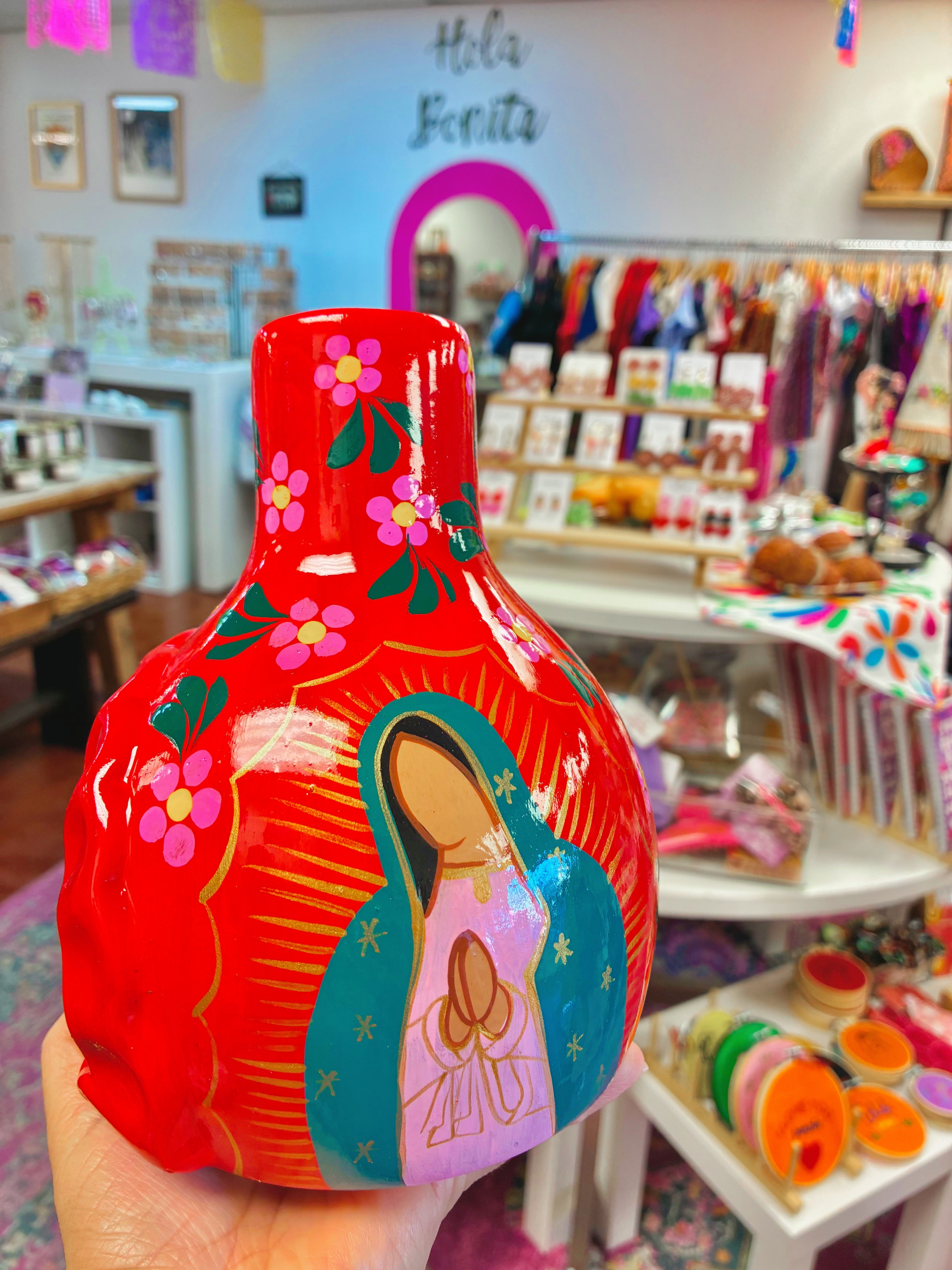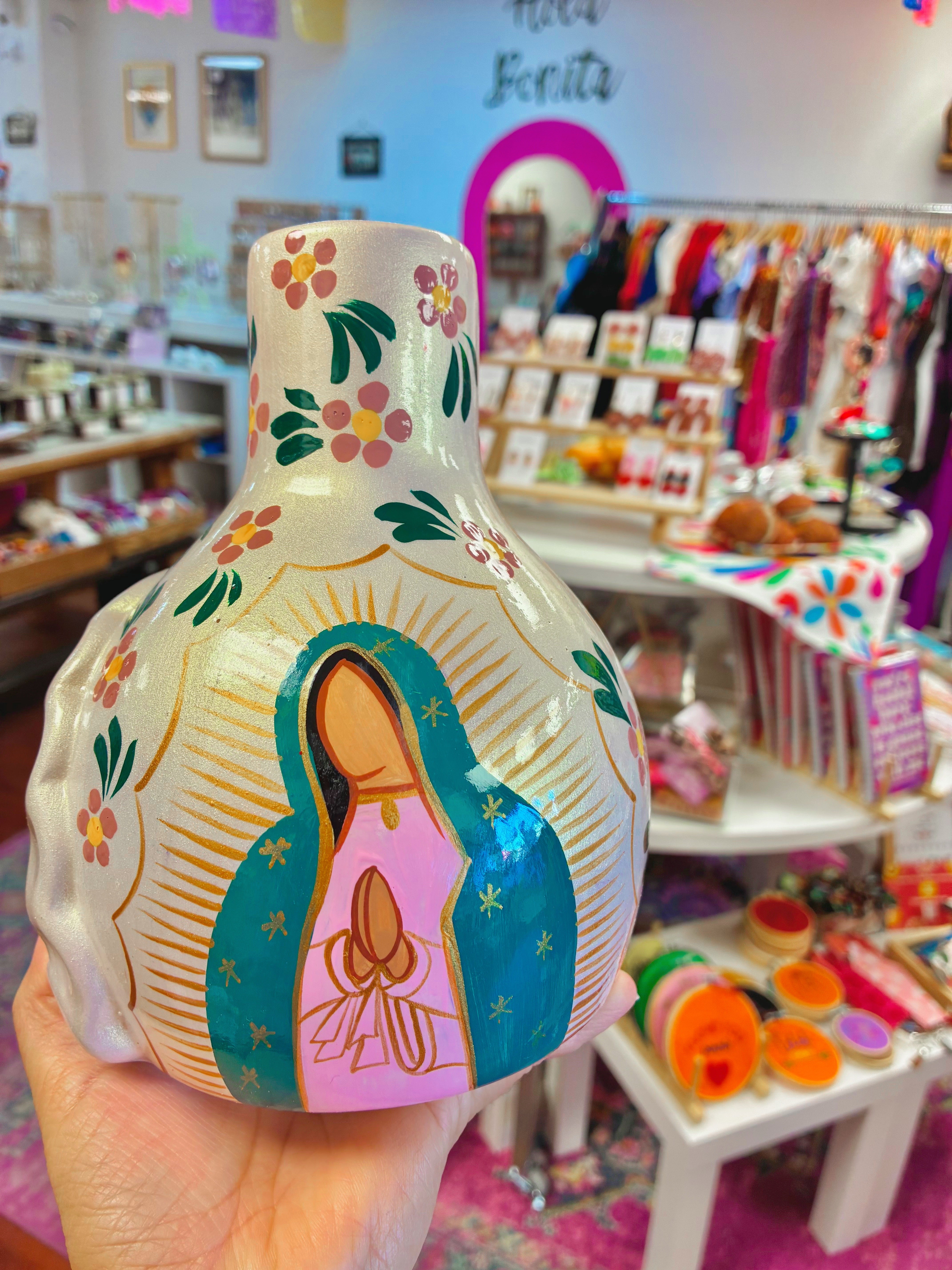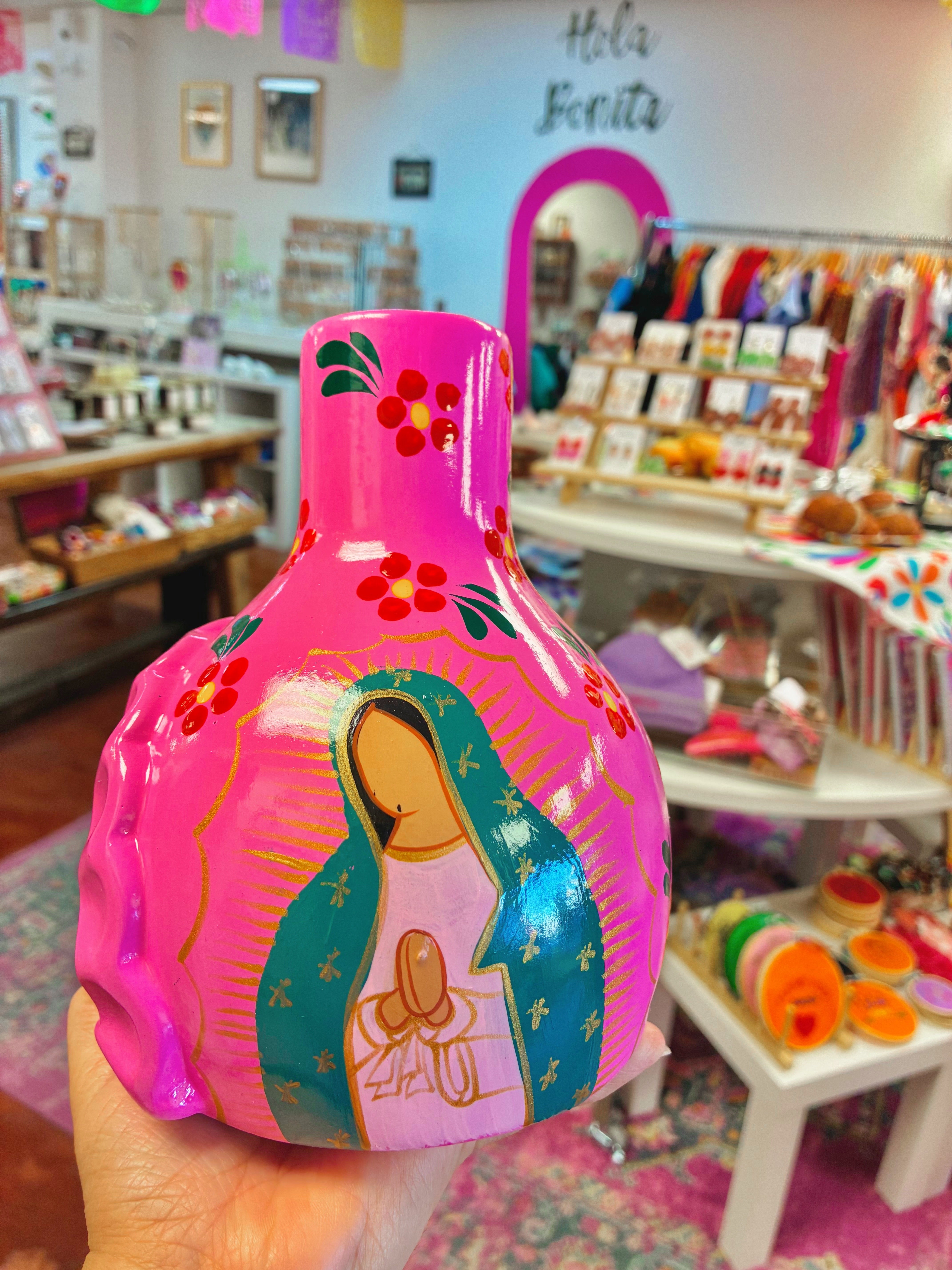 Que Chulita- Virgencita Chimenea - Pink is backordered and will ship as soon as it is back in stock.