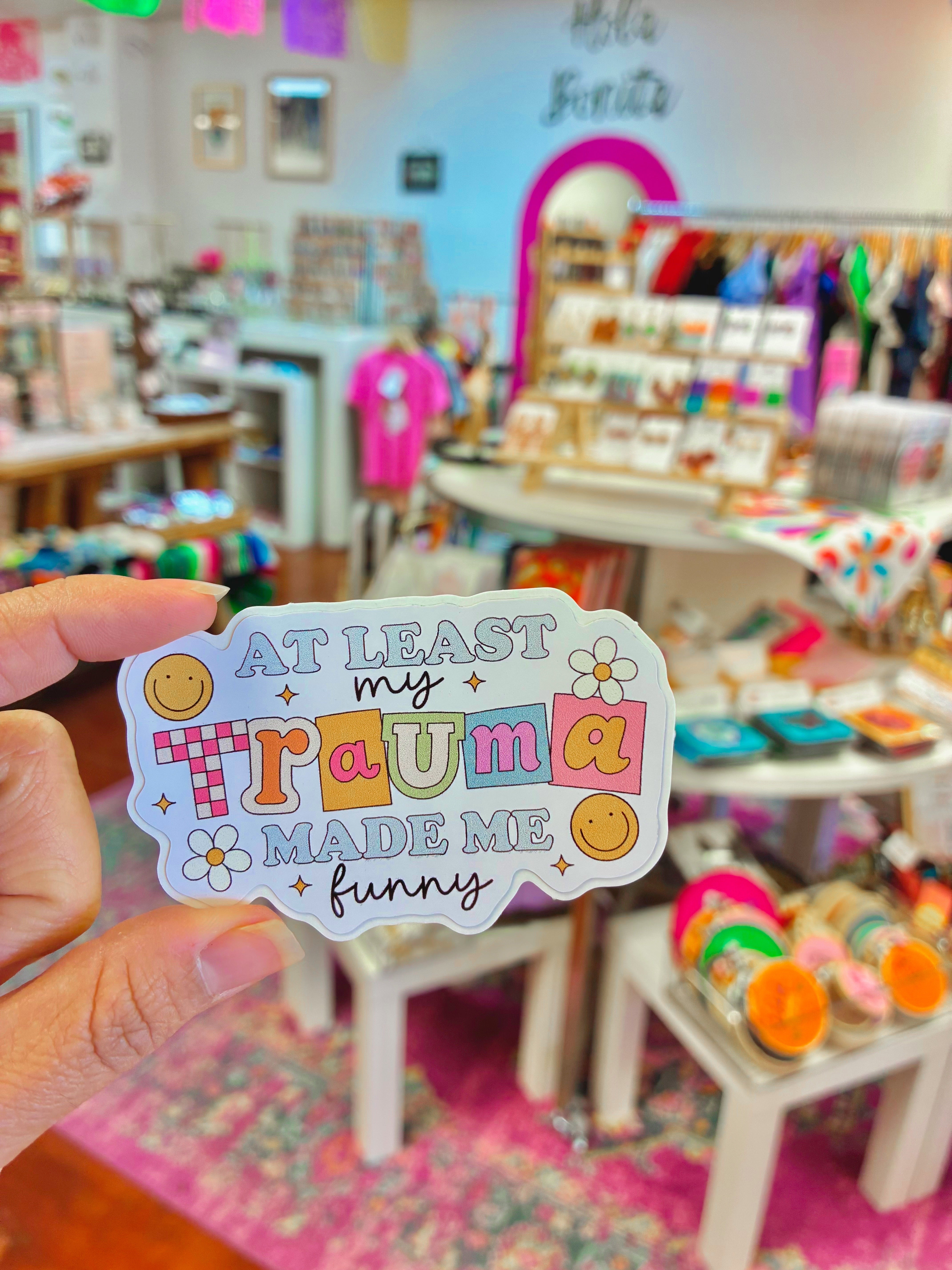 Trauma made me funny sticker is backordered and will ship as soon as it is back in stock.